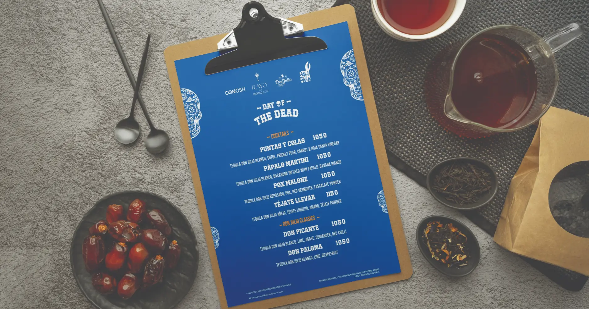For this “Day of the Dead” special menu, the goal was to capture the vibrant, mystical energy of the holiday while maintaining a premium aesthetic. The deep cobalt blue creates a striking contrast against the rustic clipboard and textured stone backdrop, grounding the ethereal theme in a tactile, high-end dining environment.