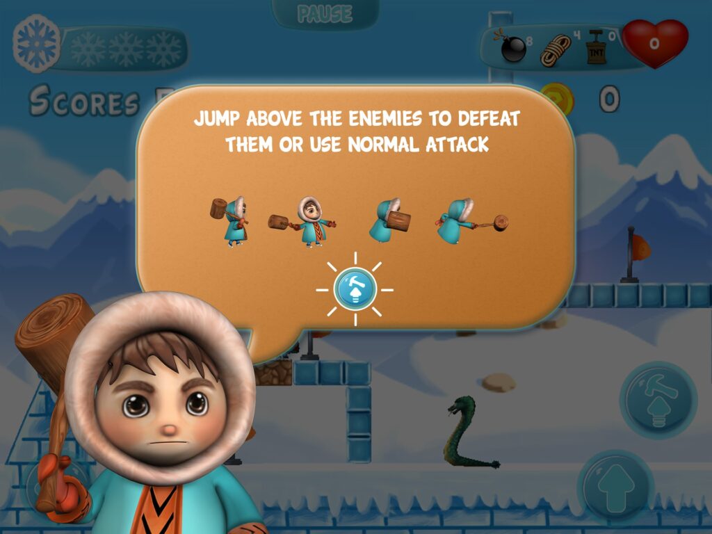 Hop into the shoes of an Eskimo in this side scrolling platformer. You are on a quest to win over the polar lands as you fight the spiders, bats, snakes, polar bears and ice dragons equipped with a hammer and bombs. Game has been designed with a lot of attention to the core gaming loops as every round is intended to teach you some skill which can be used in later levels. Fully integrated physics engine for character movement, jump / midair jump, hooking ropes, throwing bombs and breaking tiles with ice hammer.