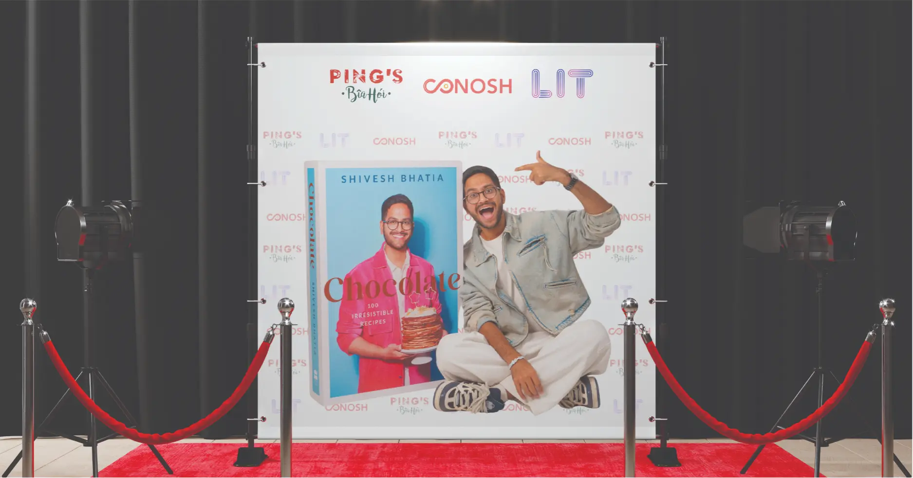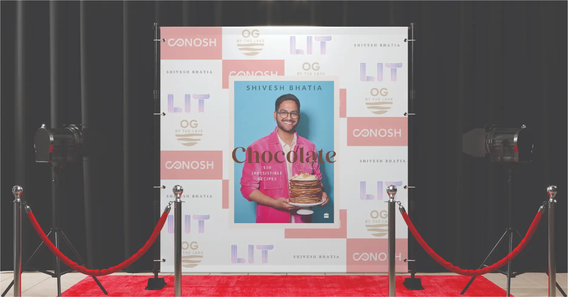 Bringing the rich, decadent world of Shivesh Bhatia’s latest cookbook to life, this launch event featured a custom-designed media backdrop and red-carpet experience. The design seamlessly integrates the vibrant aesthetic of the Chocolate cover with a clean, branded “step and repeat” pattern, creating a sophisticated space for guests and press to capture the essence of the celebration.